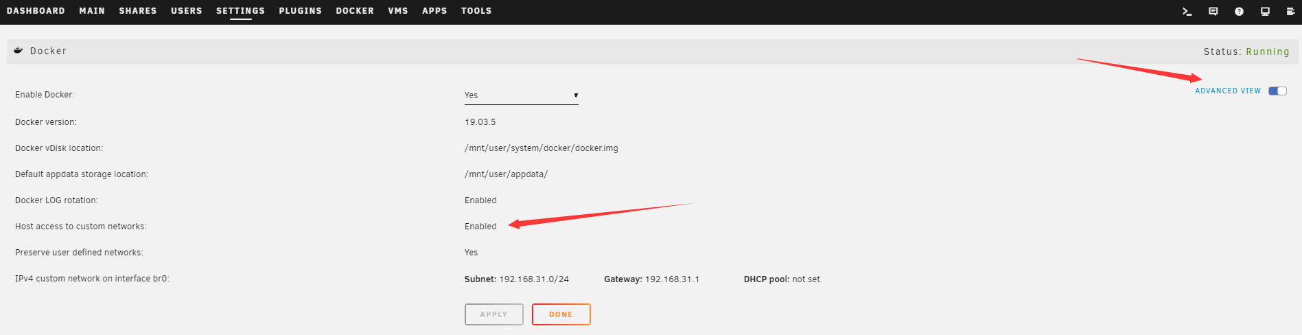 由于 Docker 的网络隔离,有时候我想进行一些特殊的操作就比较困难。比如我将所有的服务用一个 NginX 反代,但是使用 Host 或者 Bridge 方式暴露端口在宿主机上的服务就无法被反代。因此,我需要手工修改 UNRAID 的 Docker 设置。进入 Settings - Docker ,点击右上方的 Basic View ,切换成 Advanced View ,然后修改对应选项即可。这么做存在一定风险。我认真检查防火墙,保证外网的访问能够安全地被处理后,才进行这个操作。