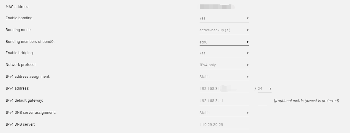 第一步需要配置网络,保证机器使用固定的 IP 地址。在阵列停止的情况下,进入 SETTINGS - Network Settings 配置网络。为了让 IP 不发生变化,建议给 UNRAID 设置一个静态 IP,网关指向当前主路由。由于目前我的网络没有运行 IPv6 服务,故没有设置 v6 地址。