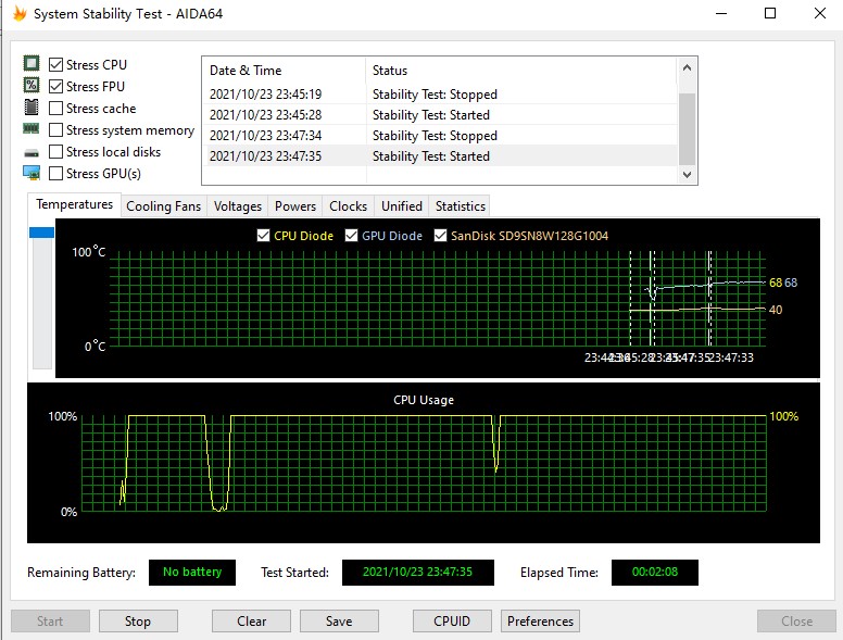 AIDA 64 CPU + FPU 烤机测试,全程保持在最高 68 度,机器几乎没有噪音。烤机功耗 30W 左右,待机功耗 15-20W。