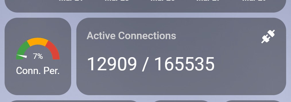 1 | {{ states('sensor.connections') }} / {{ states('sensor.max_connections') }} |